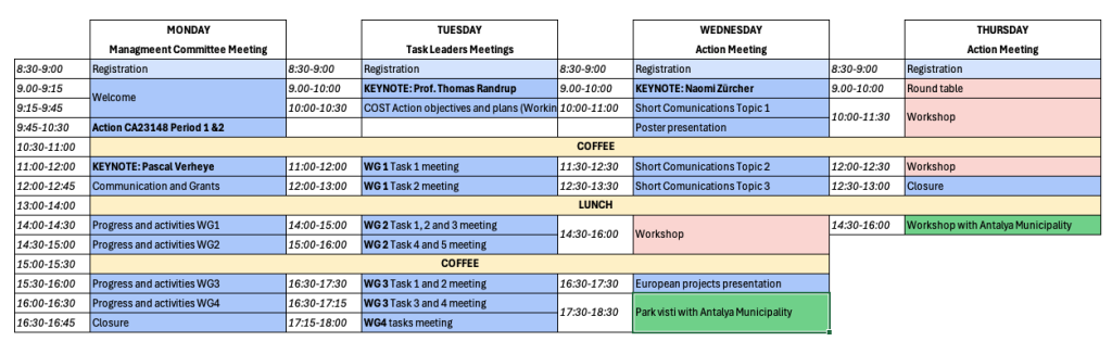 - Keynote speakers: We have three keynote presentations on topics regarding the potential of COST actions to the development of broad international research project proposals, on urban forestry management and on participatory urban forest management and planning.